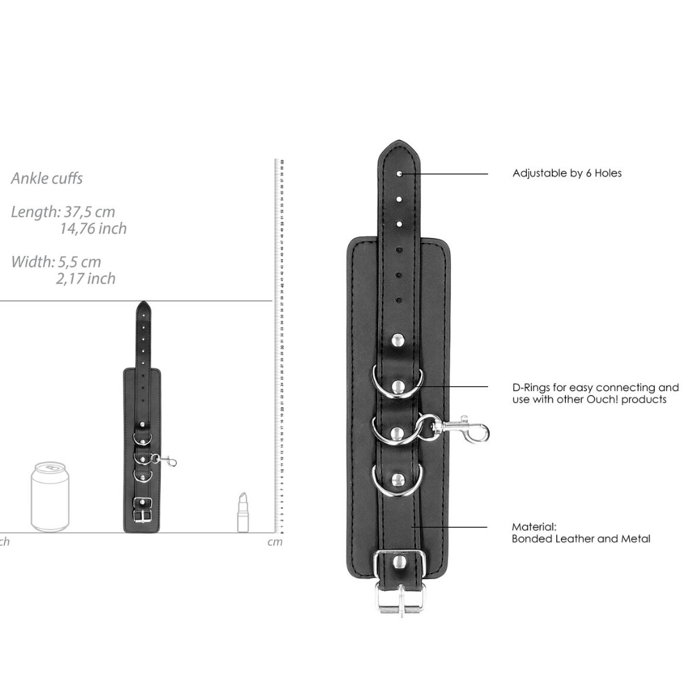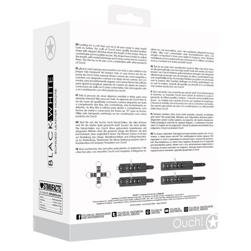 Varje manschett är utrustad med metallspännen och D ringar, vilket gör att du kan anpassa passformen individuellt och koppla ihop delarna på olika sätt med de medföljande karbinhakarna. Den praktiska designen gör det möjligt att snabbt ändra position eller frigöra handleder och anklar utan att ta av hela setet, vilket ger en smidig och flexibel lek. Korsremmen med fyra fästpunkter gör det möjligt att fixera handleder och anklar bakom ryggen för en mer avancerad bondageupplevelse.