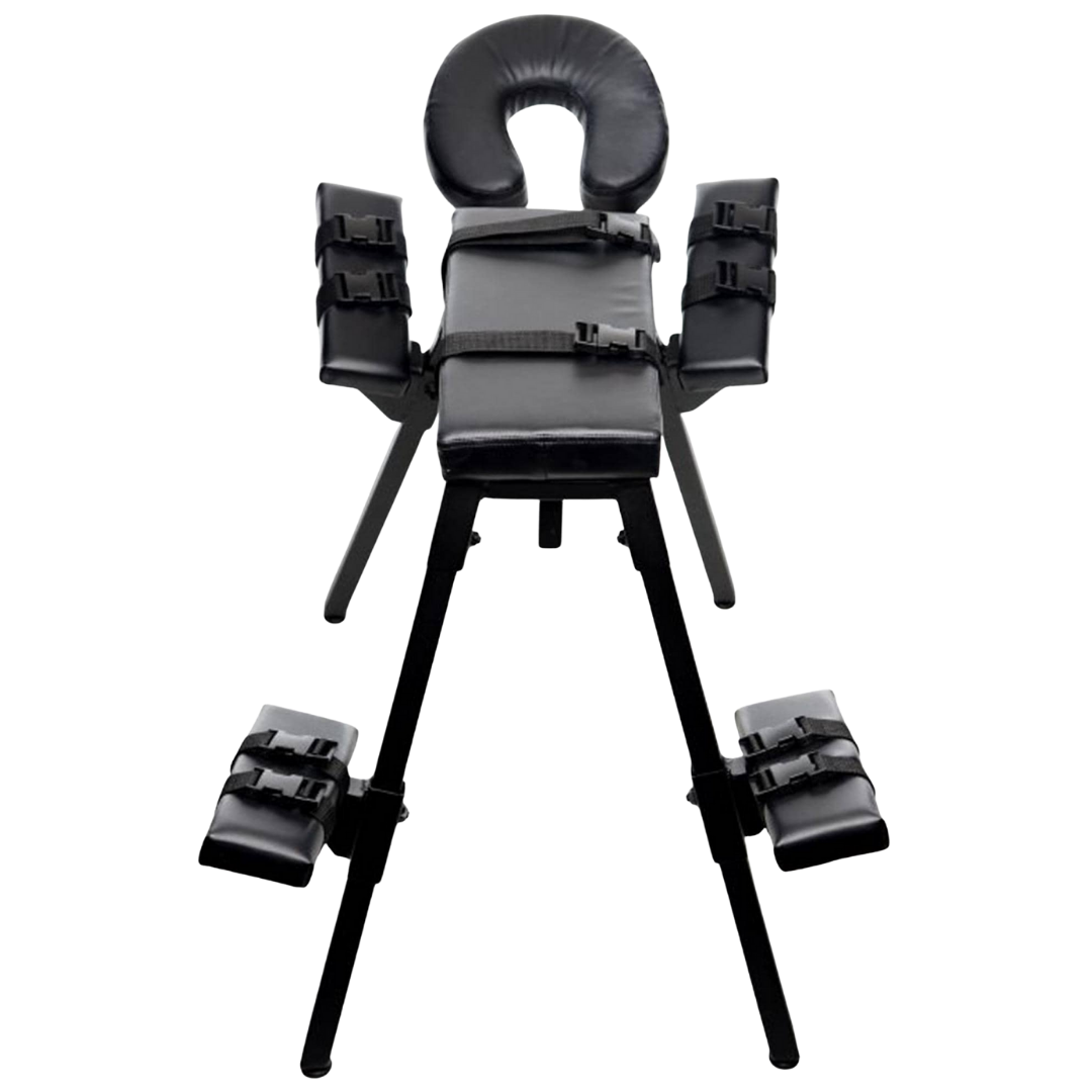 Den ergonomiska designen lämnar din undergivna i en perfekt position för maximal stimulans och komfort, och bänken kan justeras i höjd och vinklar för att passa era behov. Den vadderade huvudkudden och dynorna för armar och ben gör långa sessioner bekväma, medan starka PU-läderremmar med enkla spännen gör det lätt att begränsa rörelsefriheten när så önskas.