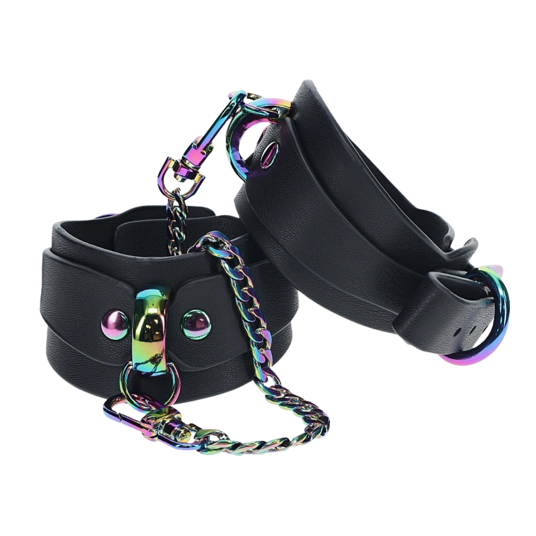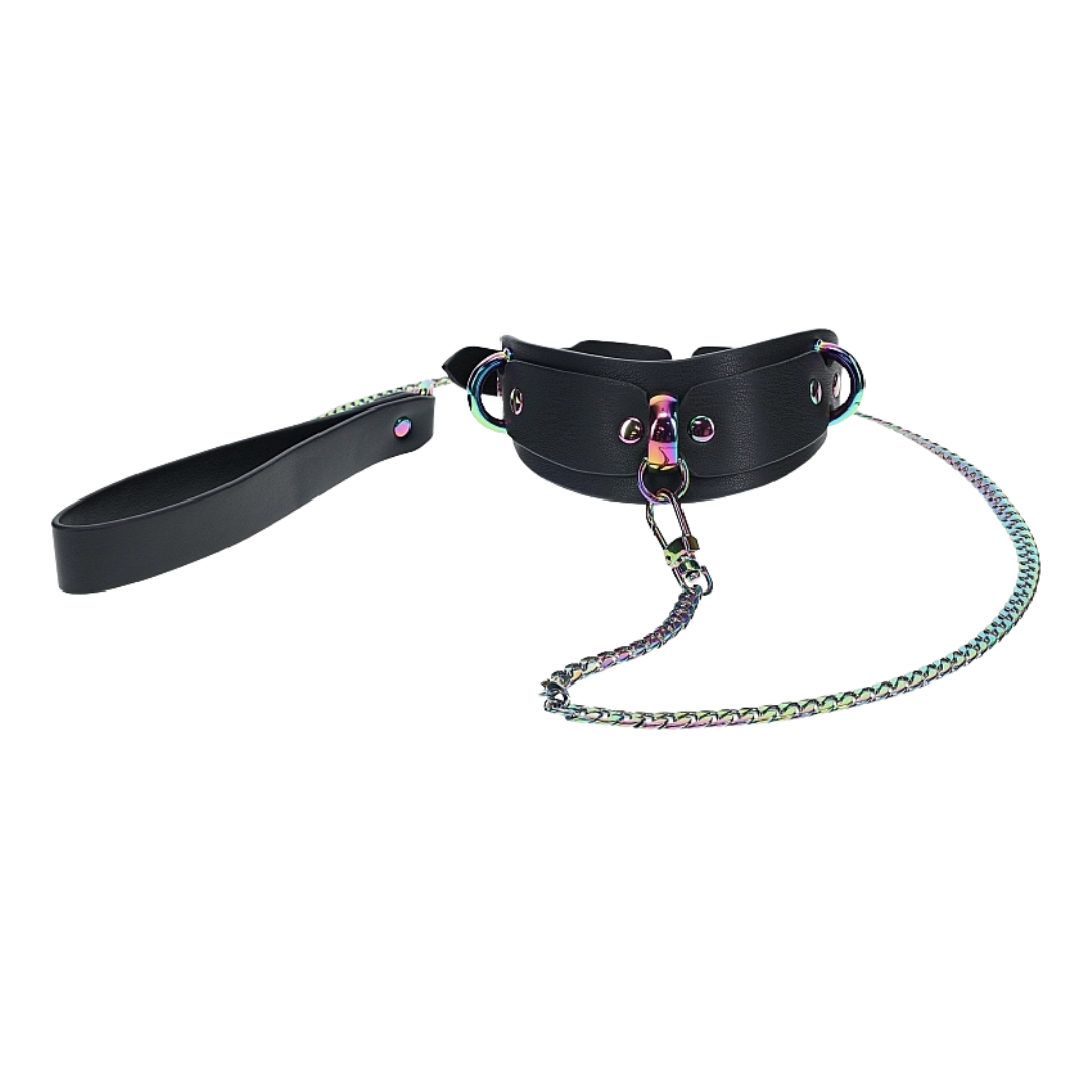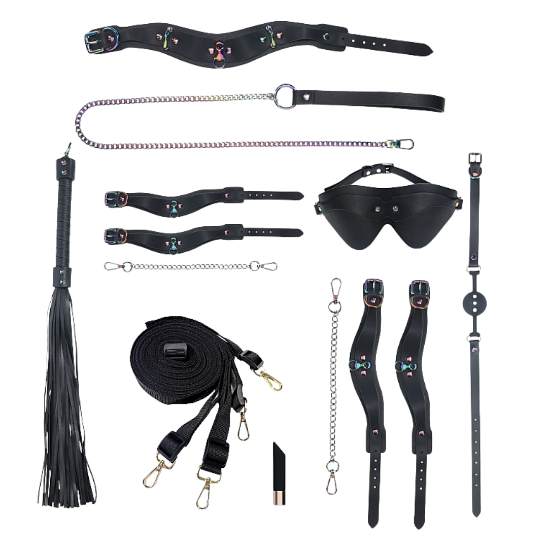 Kitet innehåller ett komplett urval av bondageaccessoarer som tillsammans skapar en mångsidig och intensiv upplevelse. Här ingår halsband med koppel, handbojor, fotbojor, ögonbindel, andningsbar ball gag, flogger, madrassfäste för fasthållning samt en uppladdningsbar vibrerande bullet. Samtliga delar är tillverkade i slitstarkt PU-läder och pryds av matchande iriserande metalldetaljer, vilket ger kitet ett enhetligt och exklusivt helhetsintryck.